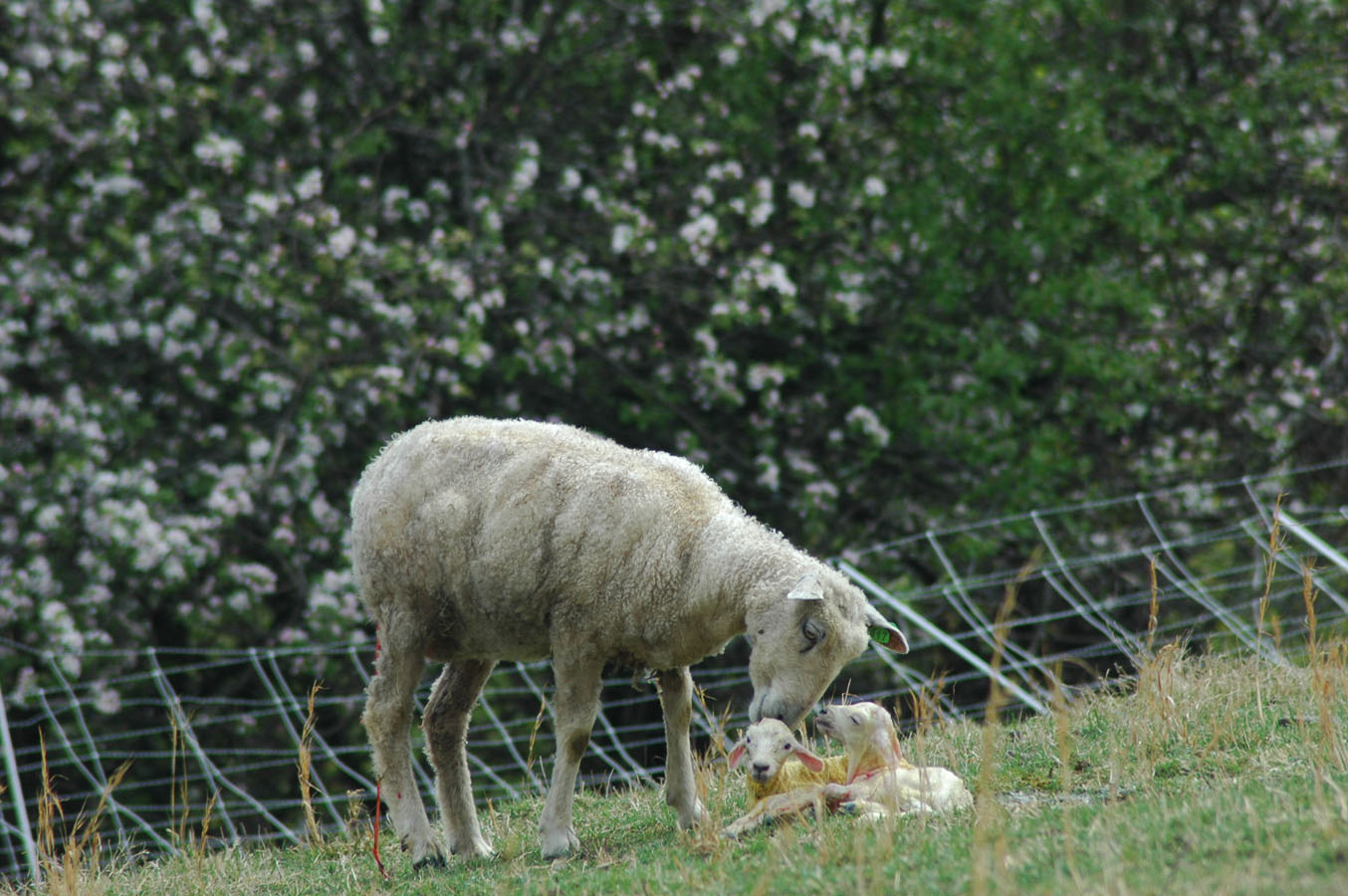 We realized sometime this week, that we have neglected to share with you the story of ‘The Little Fellas’. Born on April 24th, these little twin rams weighed 6 lbs 11 ozs and 4 lbs 15 ozs when they hit the ground. We were worried that the smallest one might not make it or might become a ‘bottle baby’, but he was strong and determined. Their mama, Dierdre, was a wonderful, attentive, 1st time mother and seemed to be intent on getting her little fellas up and going.