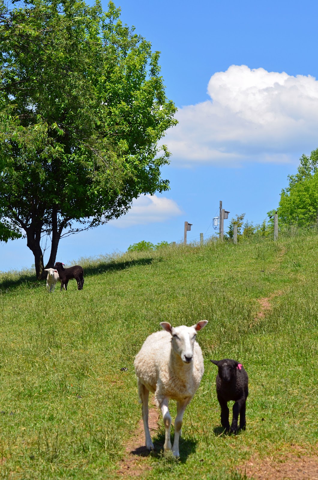 Nettie and her beautiful half-border-leicester ram lamb… loved the wonderfully blue sky and that big puffy white cloud.