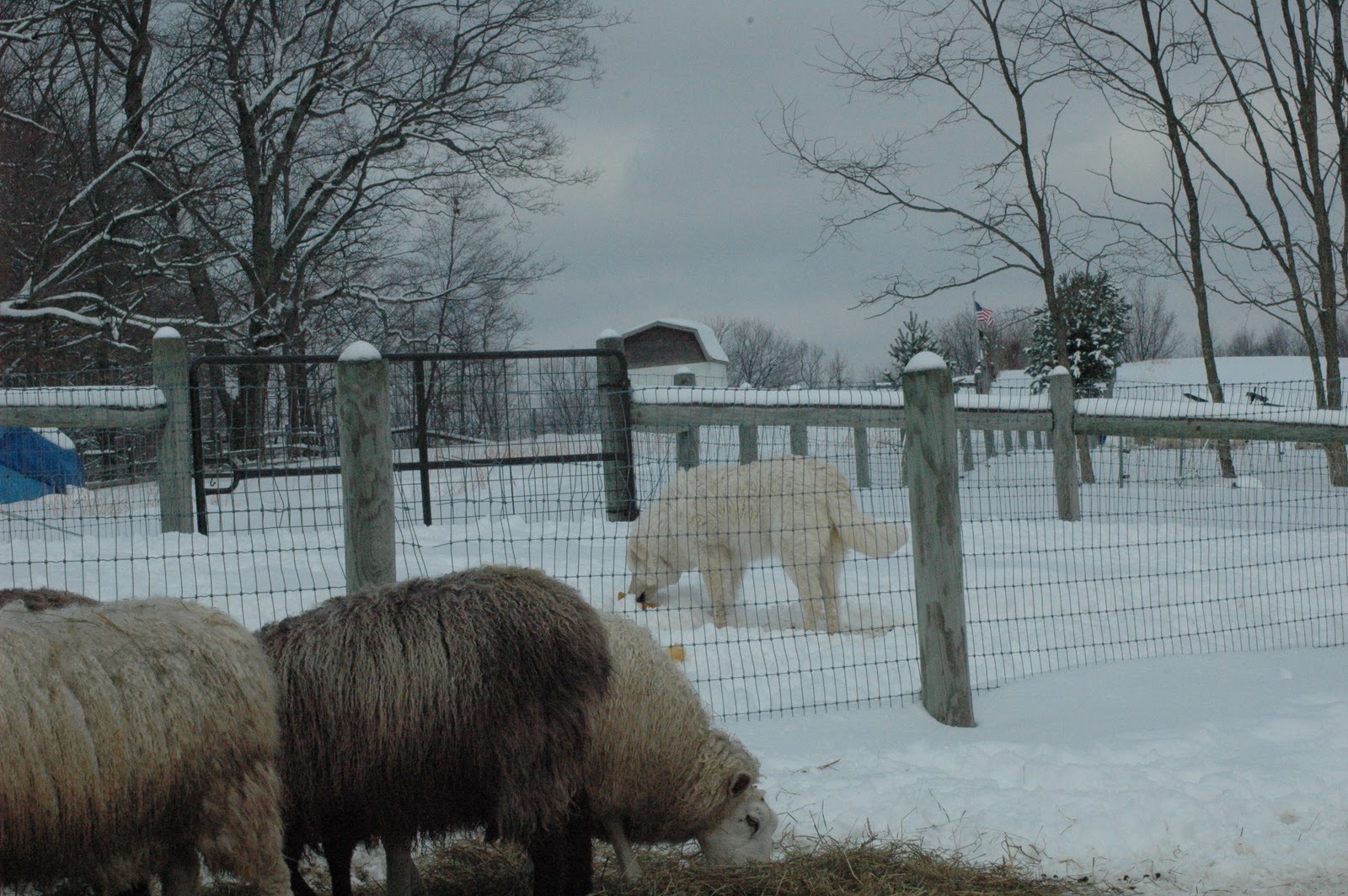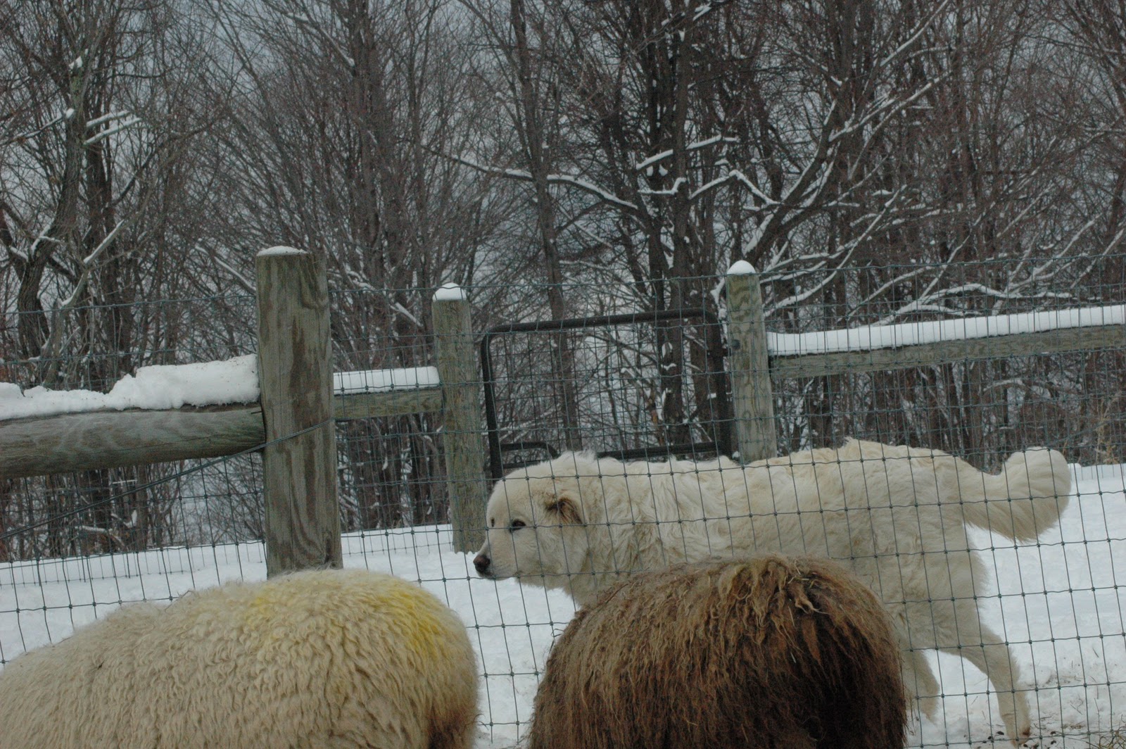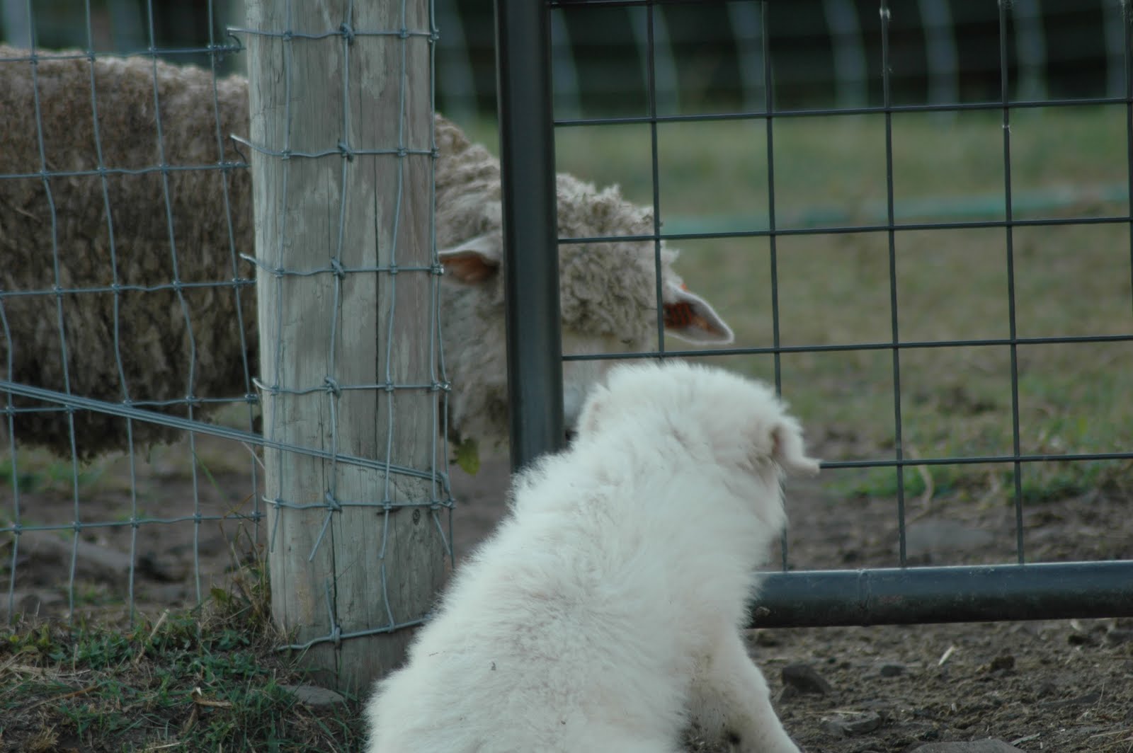 As she nears 6 1/2 months old, Belladonna’s training continues and bonding with the flock grows. She still has a little too much unrestrained enthusiasm to be left with the ewes unsupervised, so weather permitting she spends much of the day in the corral. There, woven wire fence allows her to interact with the ewes but does not allow her to cause them any anxiety. She patrols her perimeter, barking loudly at any perceived threat. She also enjoys bringing her chew toys over to show her buddies. We divide a couple bales of hay and feed them leaning up against the fence to force encourage the ewes to spend most of their time near Bella. For her part, Bella has developed her very own method of gaining sheep trust by pulling through and chewing on the odd bit of hay; thus establishing her spot in the flock.