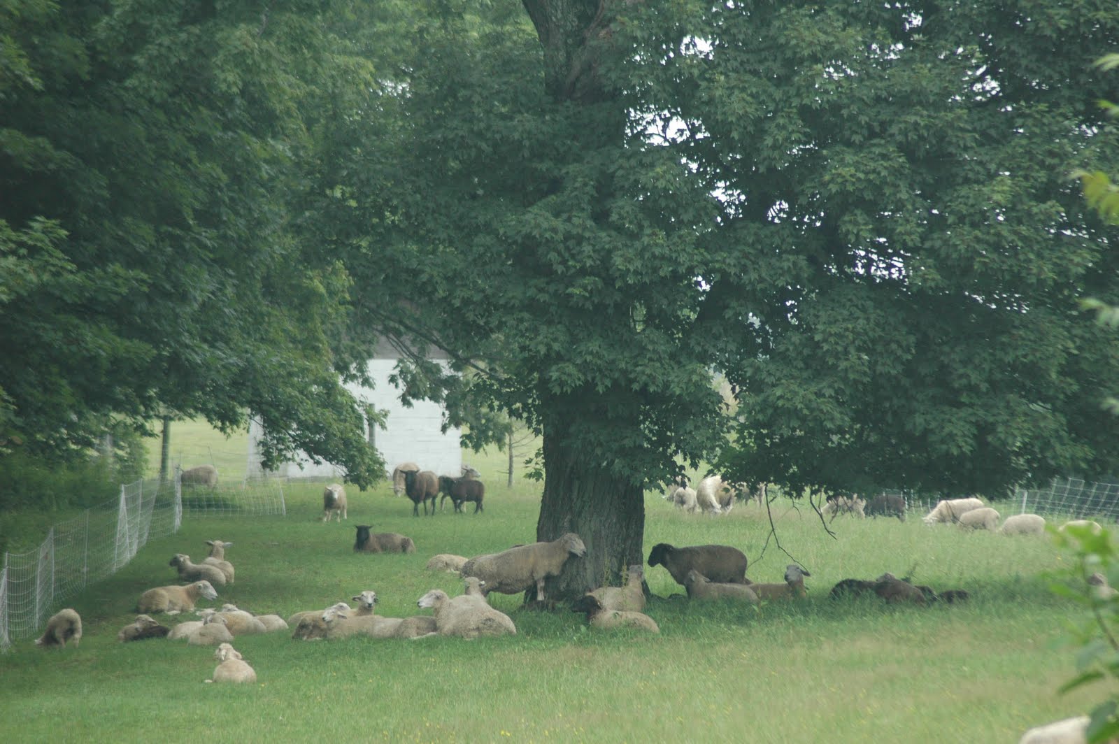 Everyone behaved very well in the barn and were very relaxed and quiet. That was wonderful because it made everything go pretty smoothly. After the shepherdess/s did some re-hydrating, we all headed back out the barn door, but to a new pasture. The ewes and lambs are now in the knoll pasture. It was very noisy for several hours as it took quite awhile for the mamas and little ones to find each other again. But everything has quieted down and they seem quite happy, once again.