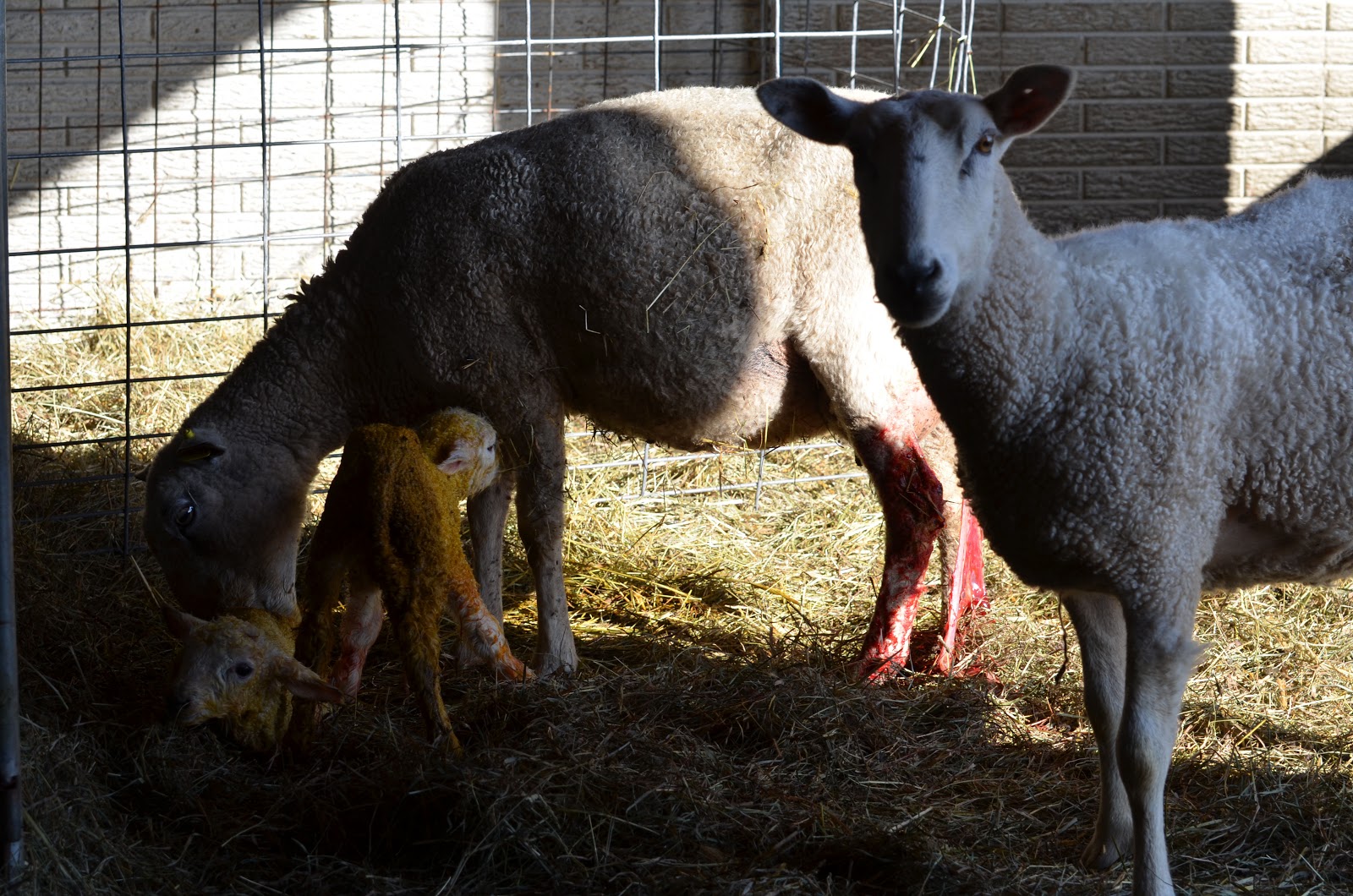 And as a grand finale to the day, we had to give a little assistance to Princess as she gave birth to a whopper of a ewe lamb, weighing 15 lbs 12 ozs. It’s hard to tell from this photo, but she is huge. We’ll try to share a better photo later. This little one had a rough entry into the world, but seems to be doing great.