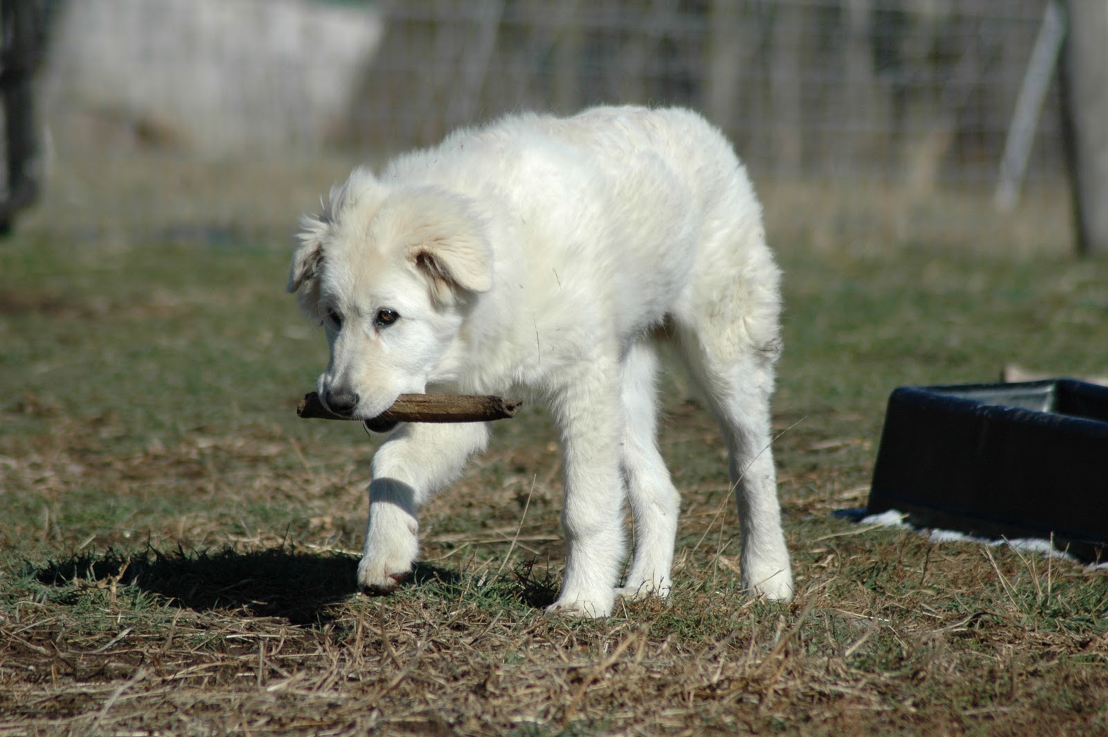 The puppies were four weeks old yesterday. They have begun to eat a little solid food and are becoming very active.They all display good livestock guardian instincts, such as barking when someone comes in the barn door.