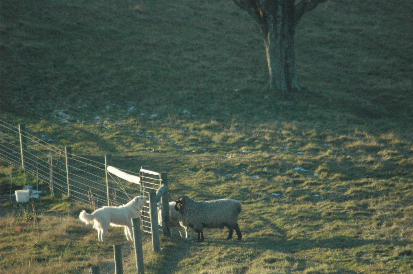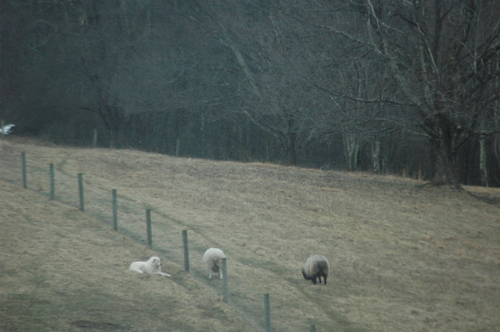 After a marathon working weekend, we finally have all the breeding ewes’ hooves trimmed, the temporary fencing up, the dogs moved, and the breeding groups in place.  Here’s a little introduction to the first of the groups.  They spent most of the day over on top of the hill.  Only Petunia and her daughter, Poppy, even came down to the fence when we fed hay this morning.