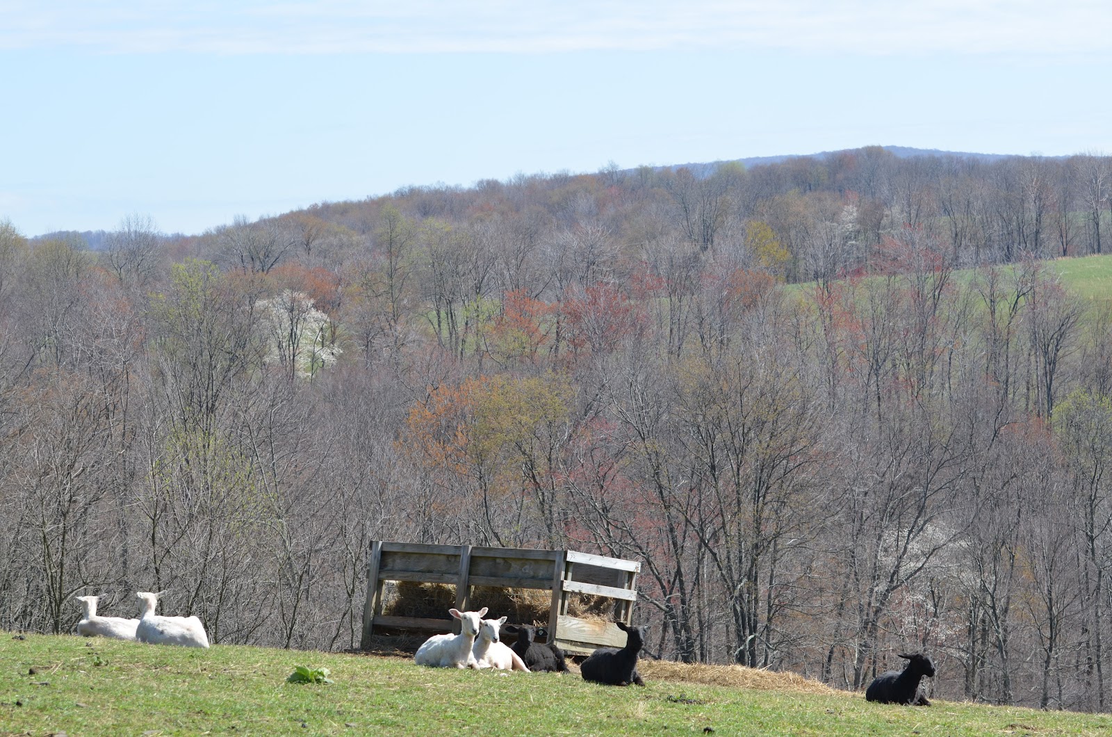 The goat tree looks a little lonely this week as the yearlings and breeding ewes have been moved into a temporary paddock in one of the hayfields. They are settled in… enjoying the large wooded area in the permanent paddock adjoining the temporary fencing for much of the afternoon… and most definitely enjoying the green, green grass of the hayfield.