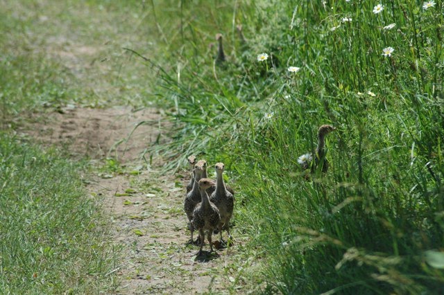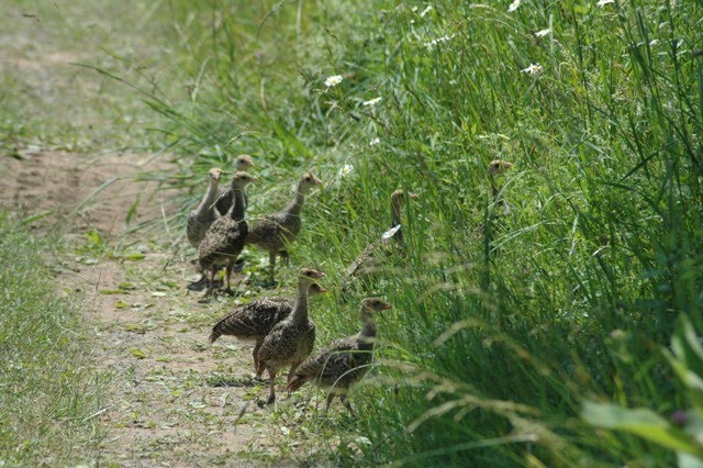 After much more clucking and peeping, Mama Hen ventured out and proceeded to encourage her poults to cross the lane.