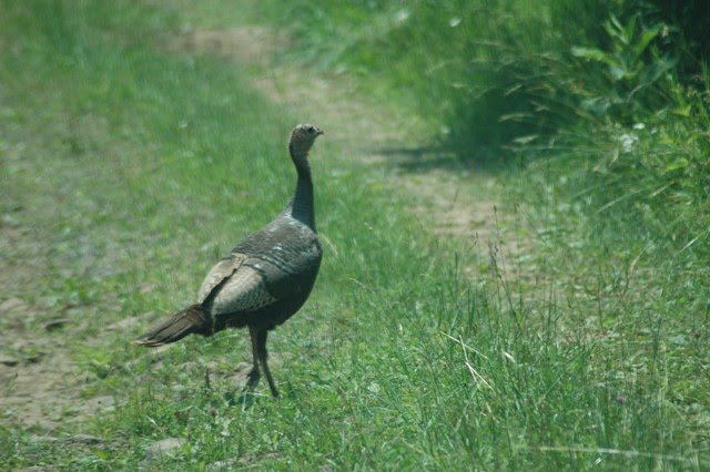 We could hear clucking and shortly found Mama Turkey peeking out of the hayfield on the left side of the lane.