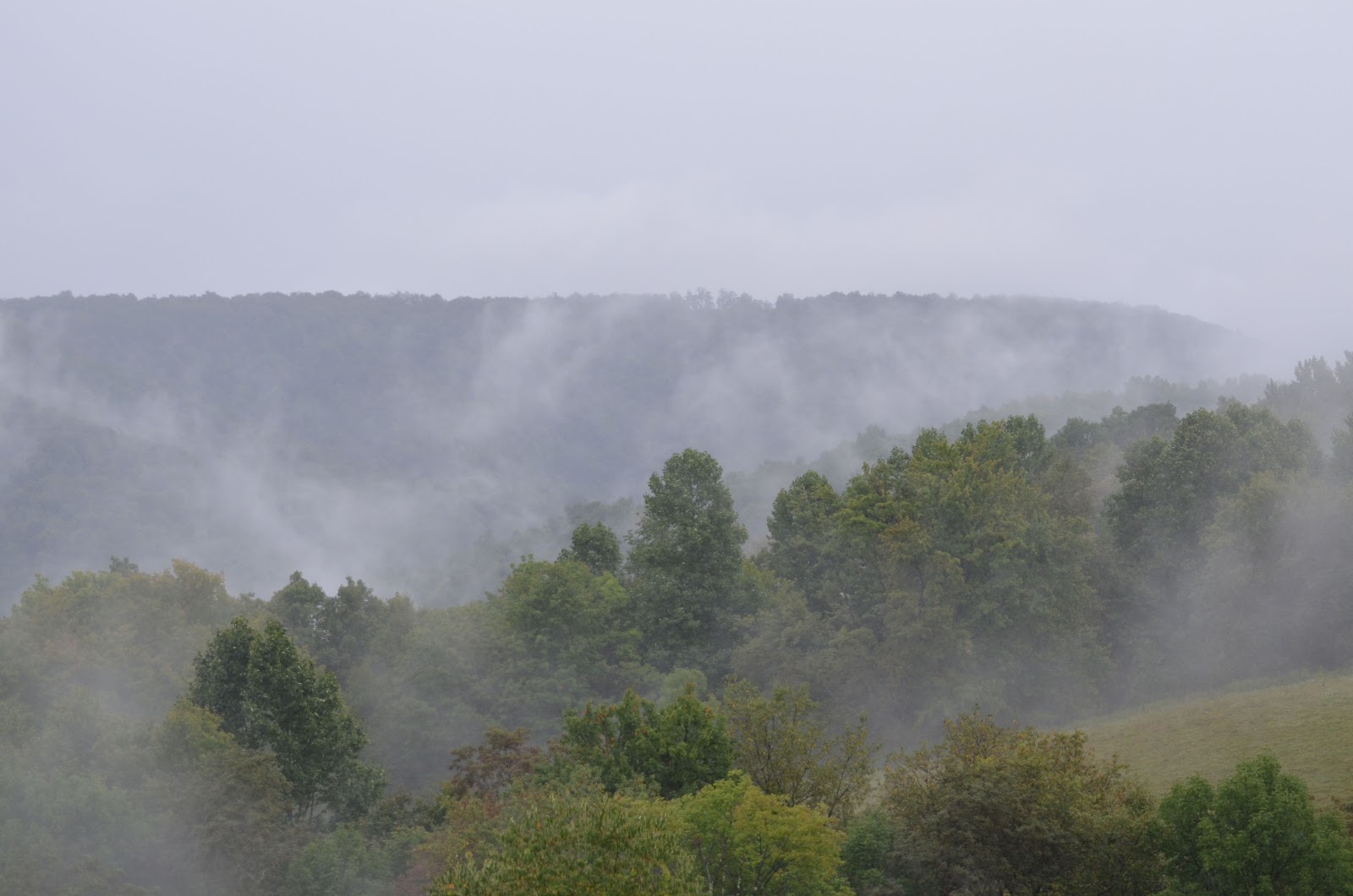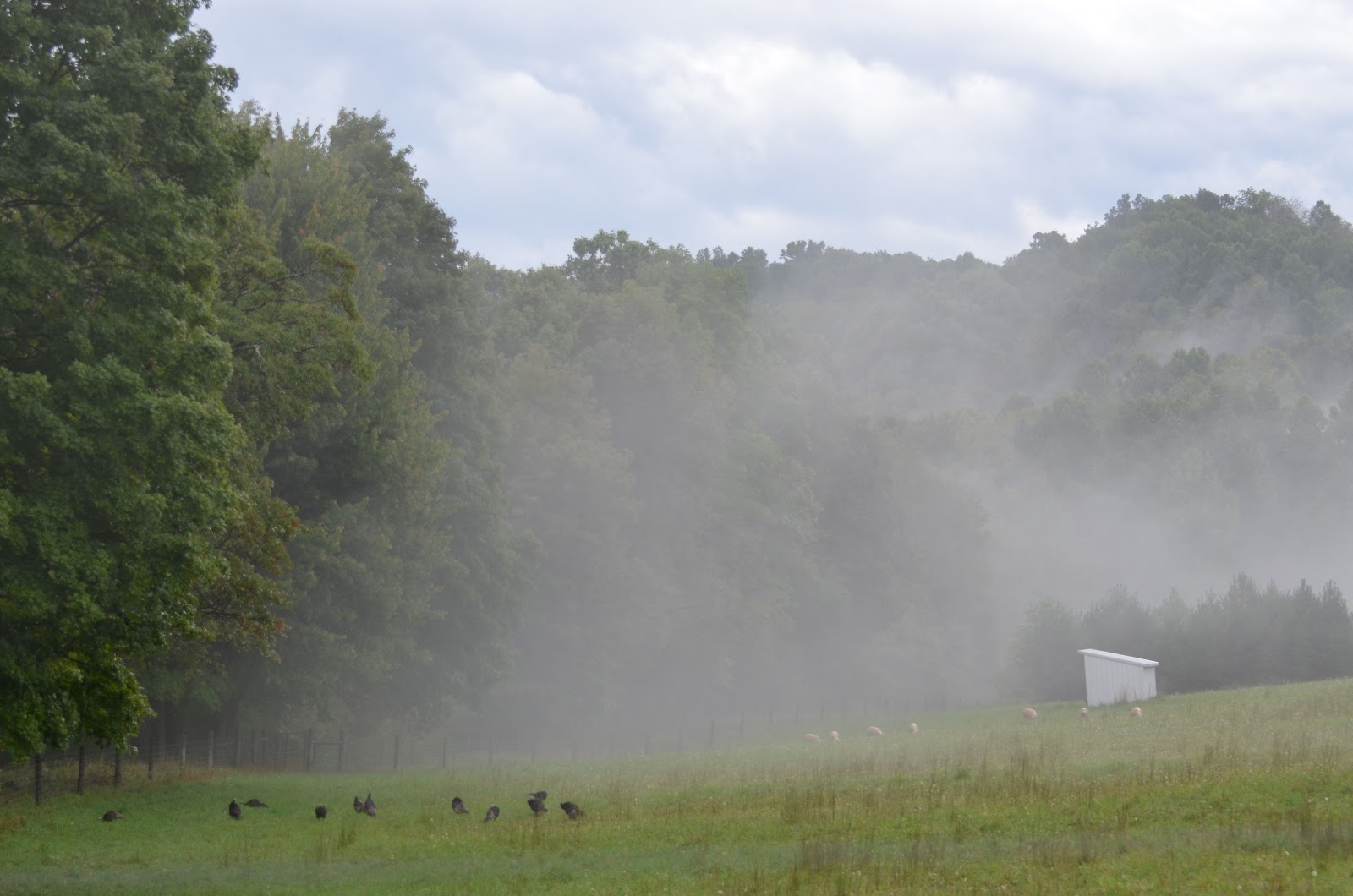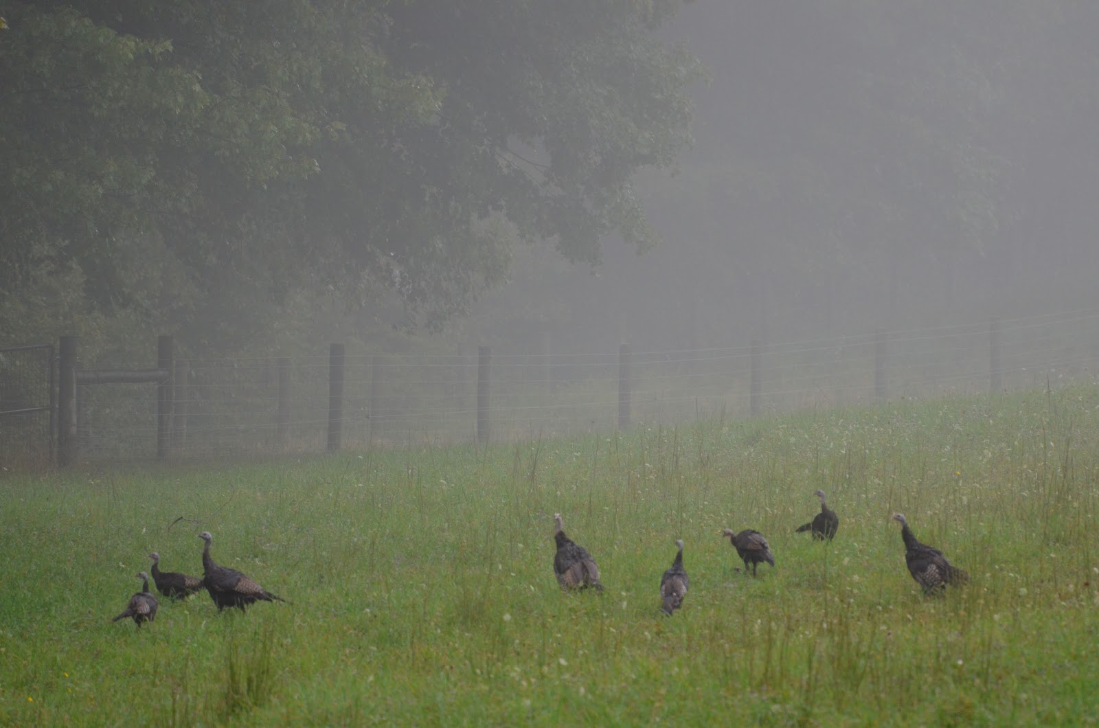 After waking up to yesterday’s gothic-like weather of constant rain and fog, it was no surprise to hear a very loud flock of birds causing quite a ruckus. It sounded like they were down in the hollow, but on the way to the old barn to get a load of hay, here they were.